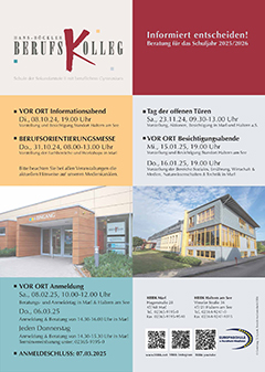 Das Bildungsangebot ist für alle jungen Menschen, die nach der Sekundarstufe I eine aufbauende schulische oder berufliche Ausbildung bis hin zum Abitur suchen, interessant. Die Ausbildung erfolgt in einem modernen und technisch sehr gut ausgestatteten Umfeld. An folgenden Terminen lädt die Schule ein: