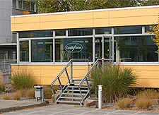 Mit Blick aus dem schön gestalteten Raum auf den Böckler-Campus oder auf der Terrasse unter Sonnenschirmen sitzend lässt sich die Pause gut aushalten.